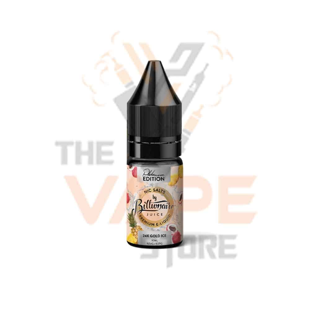 Billionaire Juice 24K Gold Ice Nic Salt 10ml Delight your senses with this tropical mix of Pineapple & Lychee with a hint of cool ice. Perfect for those with a sweet tooth who are looking for an all-day fix they won’t get enough of.