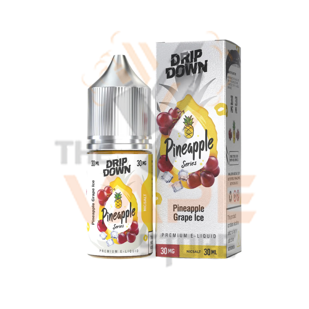 Drip Down Pineapple Grape Ice. Zesty pineapple kicks things off with a lively bite, bringing citrus-bright sweetness to the inhale. Soon after, grape rolls in, deep and juicy with a candy-like smoothness that balances the sharp edges of the pineapple. The pairing is playful yet refined, delivering a burst of sweet-tart flavor that stays engaging from start to finish. On the exhale, a crisp wave of menthol cools everything down, keeping the blend light and refreshing. Bold, juicy, and icy, this flavor offers the perfect mix of tropical zest and classic grape richness.