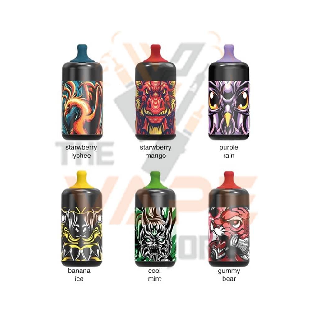 | Flavor | Aloe Grape, Banana ice, Black Mamba, Cool mint, Gummy Bear, Purple rain, Strawberry lychee, Strawberry Mango, Watermelon bubblegum, Red energy |